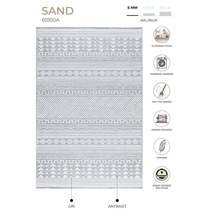 SAND PRODUCT FEATURES Our Sand collection is produced using polypropylene with Koza Carpet technology with a pile height of 4mm and a density of 320,000 stitches. HOW WAS IT MADE? By using polypropylene in modern Koza Carpet looms; It is produced on high-speed computer-controlled machine benches with high stain resistance, long life, durability and color fading. TECHNICAL INFORMATION -Polypropylene -320.000 stitches -4mm pile height -1,250gr/m2 USAGE AREAS -It can be used in balcony and terrace areas. CARE AND CLEANING Clean your carpet daily with a vacuum cleaner with a brush. Do not wipe with chemicals such as bleach, alcohol, etc. Do not wash it yourself, wipe it with a wet cloth and ventilate it. Sweep your carpet in the direction of the pile. Do not leave sharp, hard, heavy objects and items placed on the carpet in the same place for a long time. When not in use, keep your carpet in rolls away from moisture and vertically. Do not expose to direct sunlight. The above reasons and stains during use exclude your carpet from the scope of warranty.