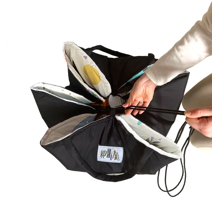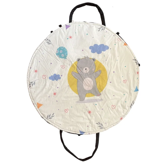which looks like a quality gaming carpet that attracts attention with its delightful figures and sweet design, turns into a stylish bag that mothers can easily use with a single touch. Parents can easily use it to collect the clutter at home or to bring all the toys together in one place at a picnic, in the park, on the beach. This design, which is a play carpet at play time, completes its task as a bag that brings all the toys together when the game is over.