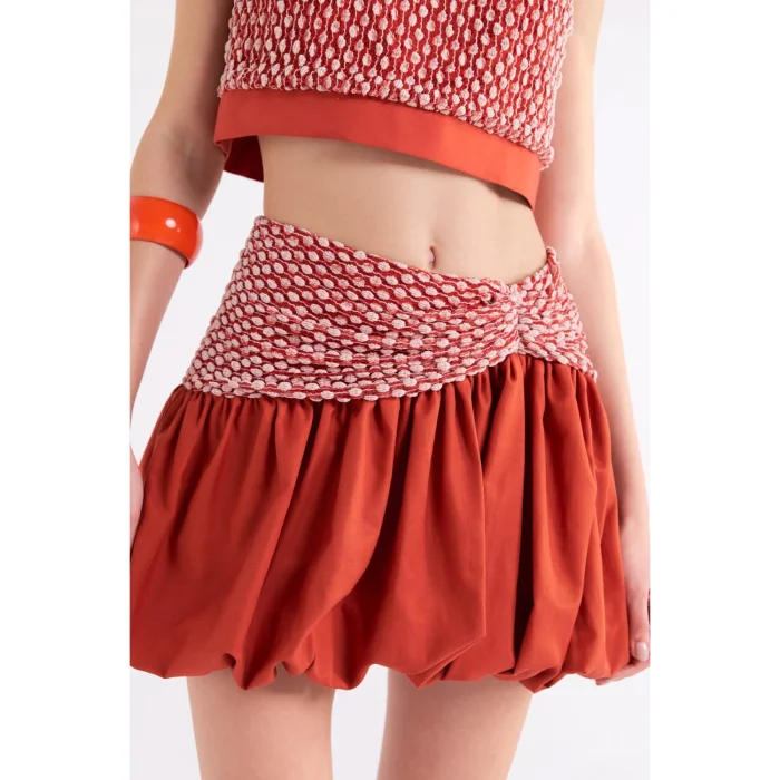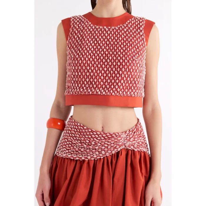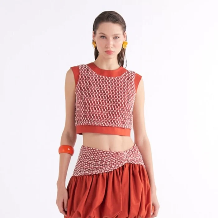 Orange crop top with satin trim.