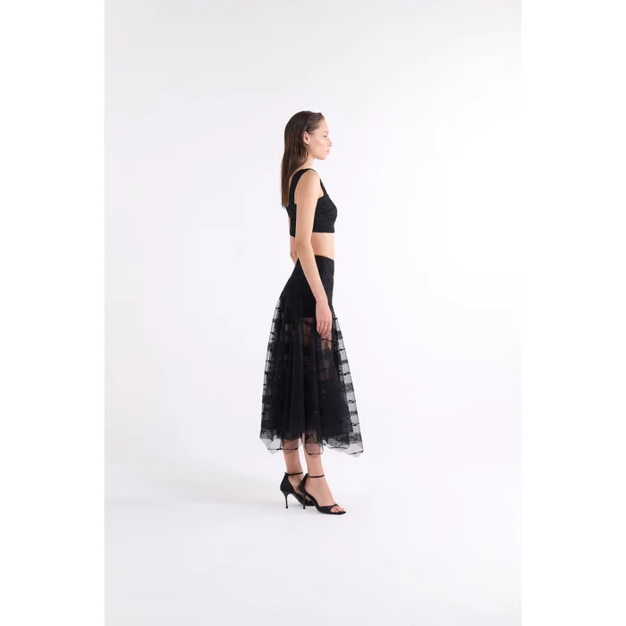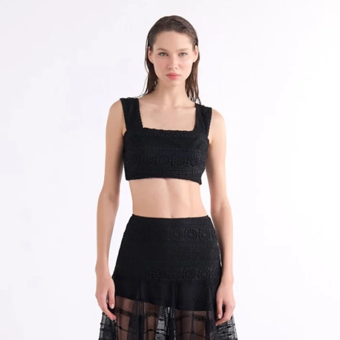 Black, textured crop bustier with a square neckline.