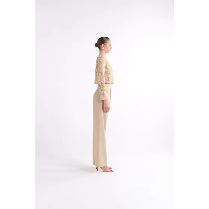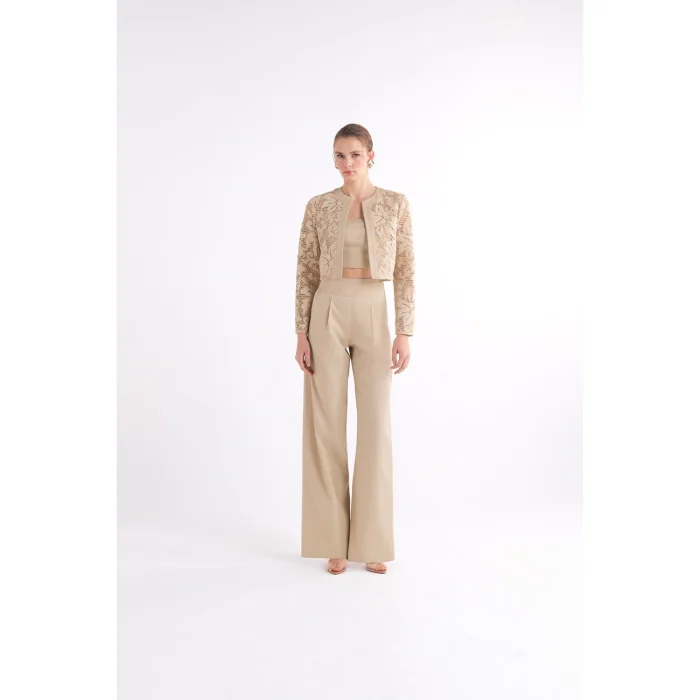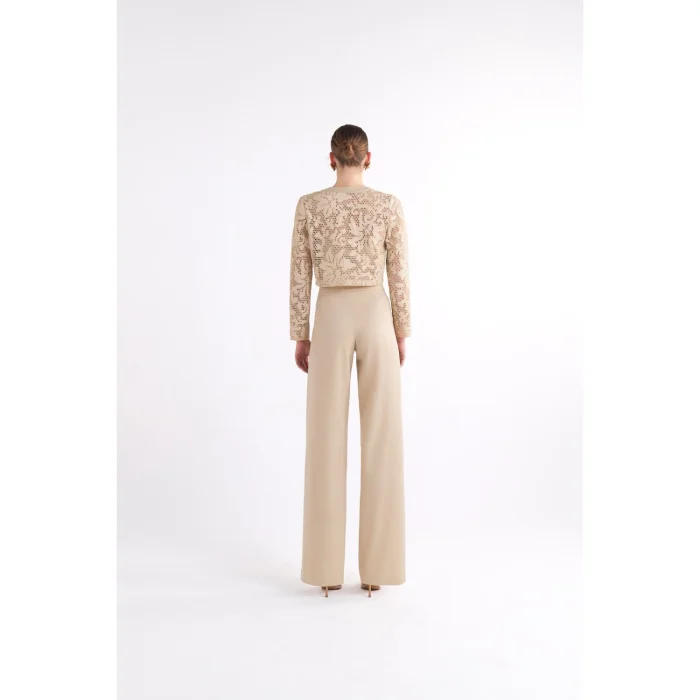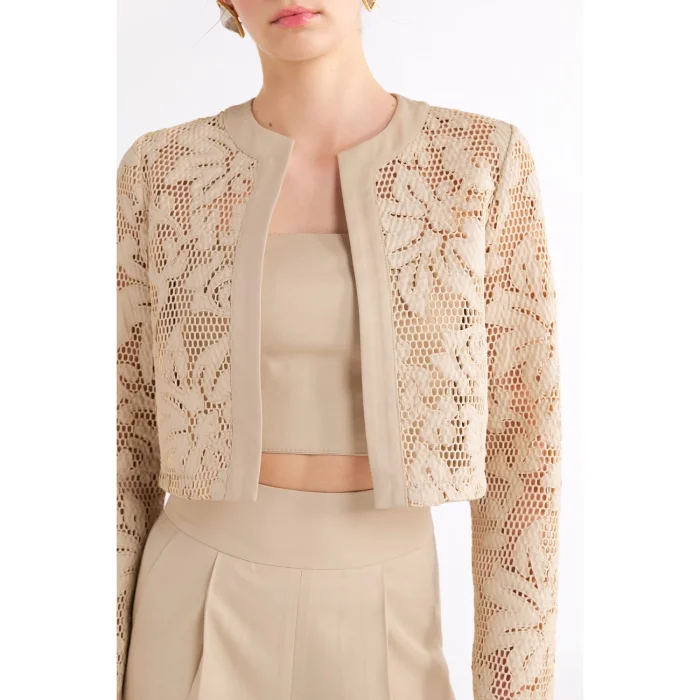 Long-sleeved crop jacket with lace details.