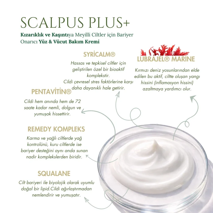 SCALPUS PLUS+ Barrier Repair Face & Body Cream is developed for skin experiencing dryness, sensitivity, redness, and oil imbalance, with a special formula designed to help support the skin barrier. Suitable for both face and body, it helps soothe, moisturize, and rebalance the skin.