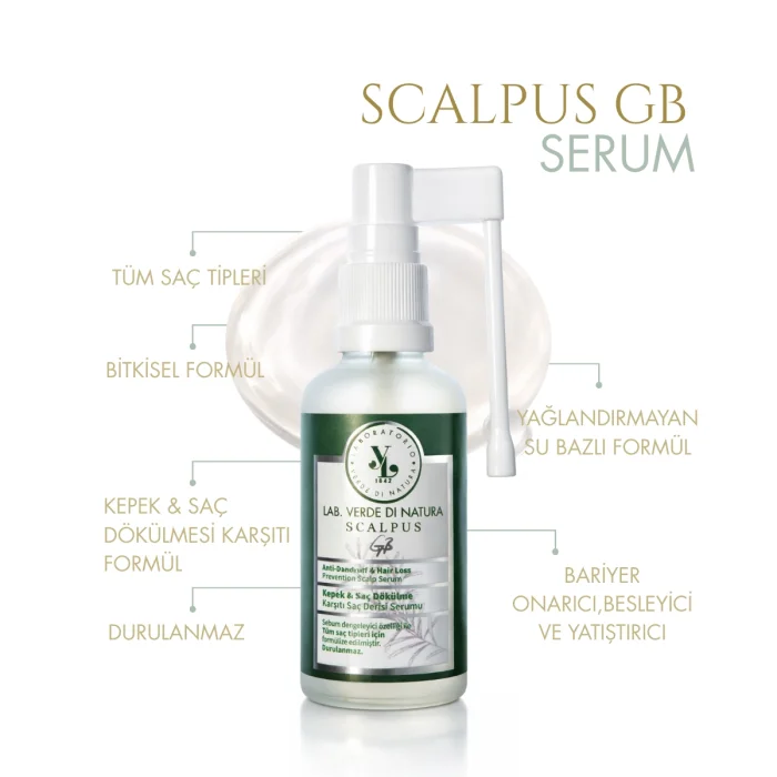 The Scalpus GB Scalp Serum, with salicylic acid, helps reduce the appearance of dead skin buildup and dandruff on the scalp, while its peptide complex, biotin, and amino acids target the supportive structures around the scalp to help hair roots feel stronger and hair strands feel fuller.