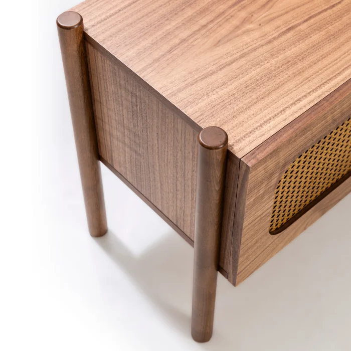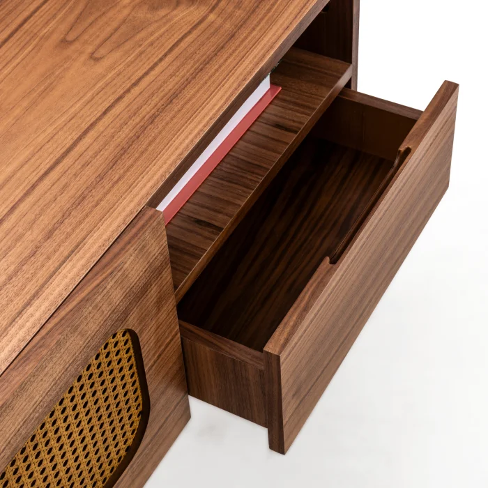 Discover: Rattan TV Stand . Designed to elevate your TV experience with style. The wooden material creates a natural, warm feel, while the cabinets and drawers provide both aesthetic appeal and extra storage. Minimalist, functional, and durable—an ideal choice for a modern living space. The body and legs are made of Natural Walnut Wood veneer. Therefore, each product has a unique texture, and variations in grain pattern and color tone may be observed. Crafted from natural rattan material. Easy Assembly : Assemble effortlessly with no additional tools required.