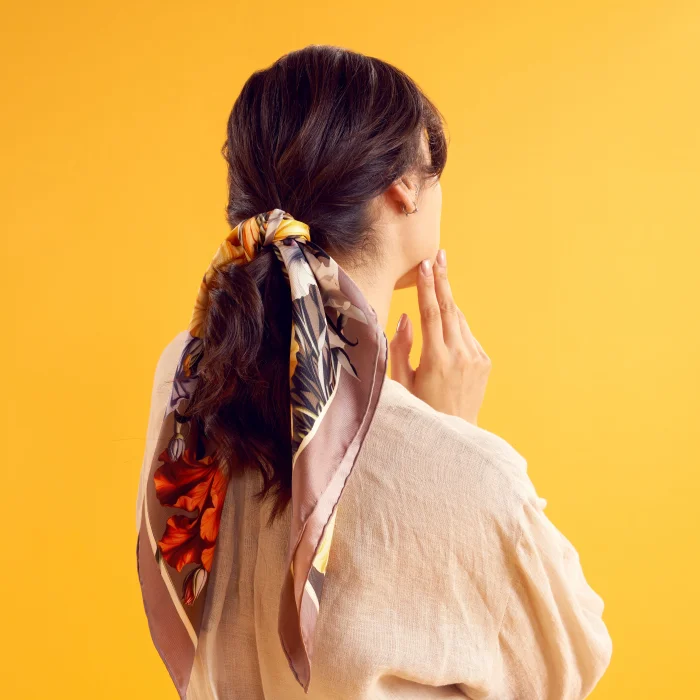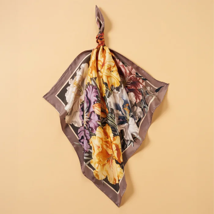 Material: 100% Twill Silk (14 mm) Edge Workmanship: Carefully hand-sewn by artisans. Pattern: Floral Size: 65x65 cm Usage: You can use it as a neck scarf, hair accessory, belt, bag or shoulder accessory.