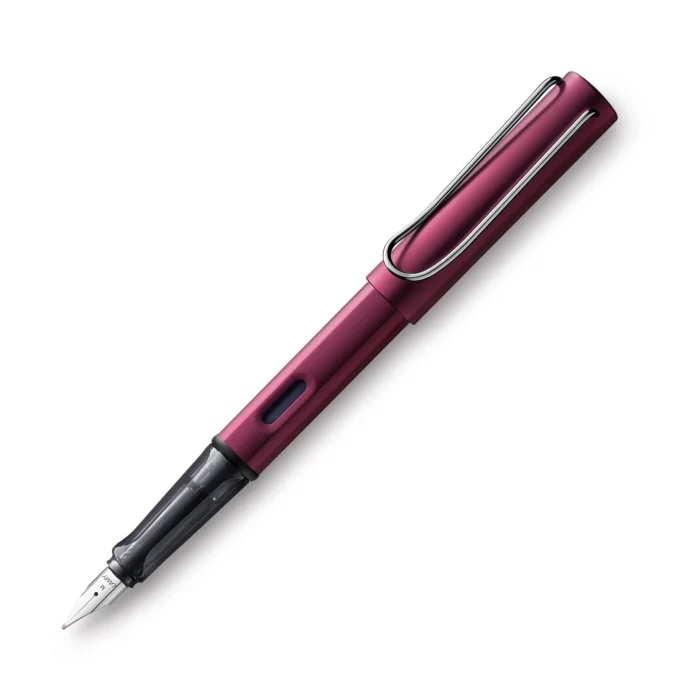 LAMY AL-star series dark purple fountain pen Aluminum housing Flexible Metal Clip Ergonomic Grip Polished steel nib Tip thickness Broad (B) Includes LAMY T10 blue ink cartridge. It can be modified with a Z24 piston to provide ink use. Designer: Wolfgang Fabian International Design Award: IF Made in: Germany