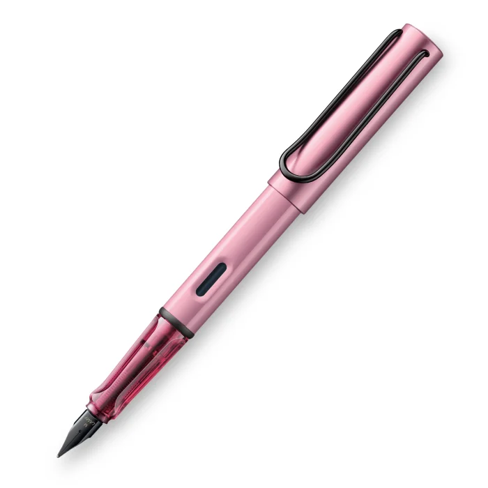 Autumn pink, can be used with anodized aluminium body / unique flexible metal clip / ergonomic transparent grip / glossy black steel nib / with LAMY T10 blue ink cartridge / with LAMY Z 28 fountain pen piston