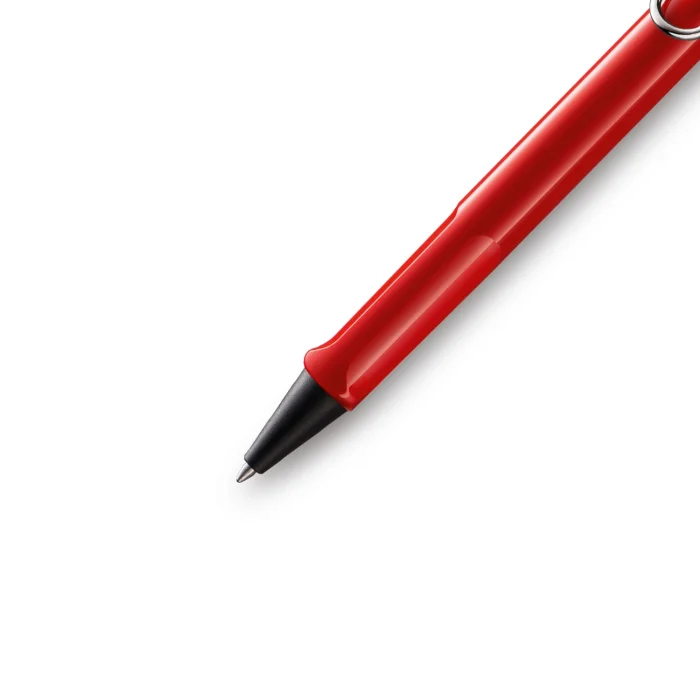 LAMY Safari series bright red ballpoint pen. Durable plastic housing Flexible Unique Metal Clip Ergonomic Grip The LAMY M16 includes a blue reflector. Designer: Wolfgang Fabian International Design Award: IF Made in: Germany