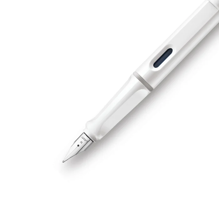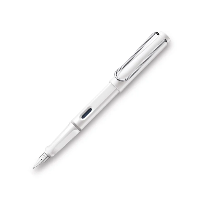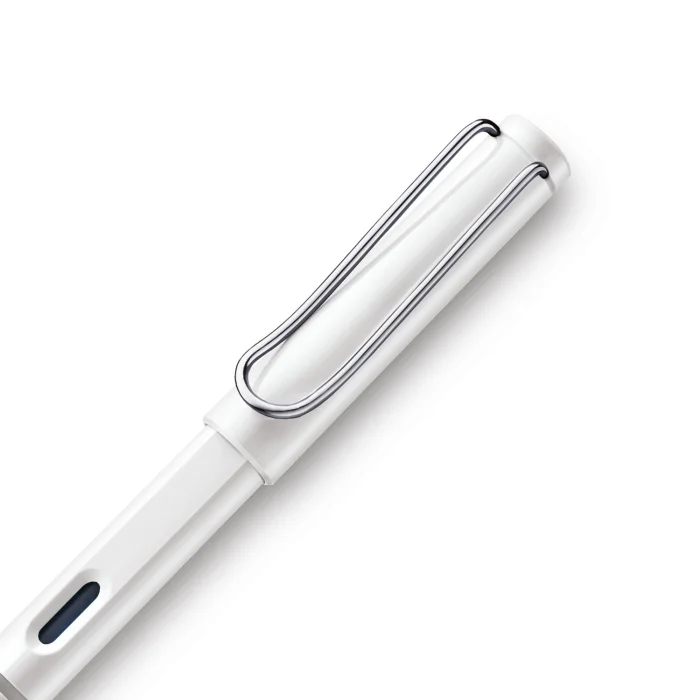 LAMY Safari series glossy white fountain pen Durable plastic housing Flexible Unique Metal Clip Ergonomic Grip Polished steel tip Tip thickness Fine (F) Includes LAMY T10 blue ink cartridge. It can be modified with a Z24 piston to provide ink use. Designer: Wolfgang Fabian International Design Award: IF Made in: Germany