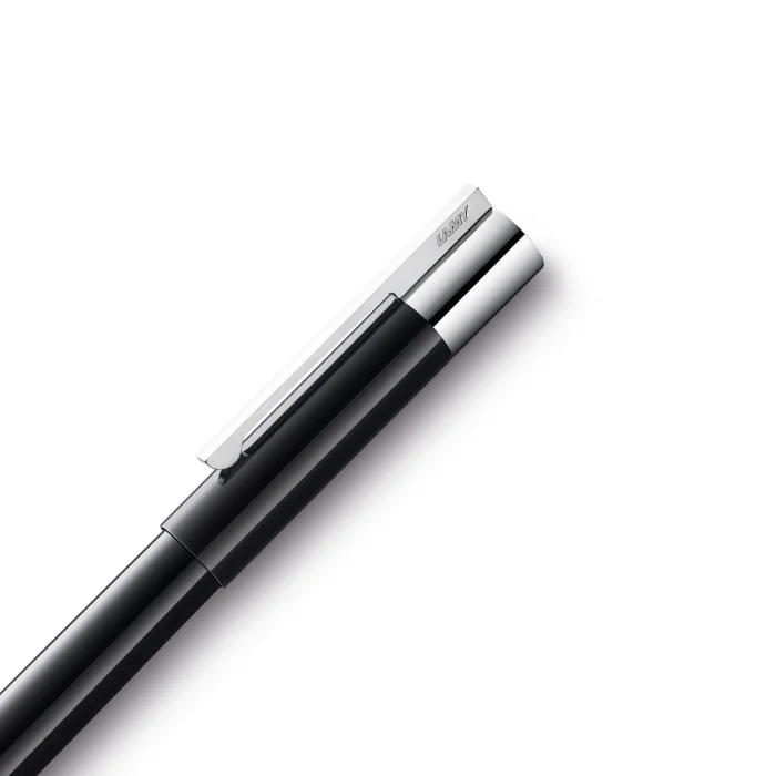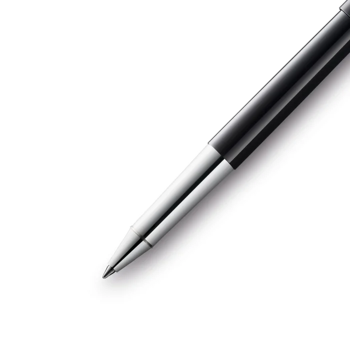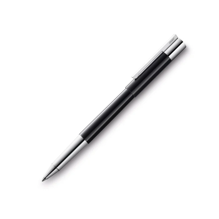 LAMY scala series roller pen with glossy black lacquered body Polished chrome-plated grip and clip LAMY M63 contains black reflect, Designer: Sieger Design International Design Awards: Good Design, IF and Red Dot Made in: Germany