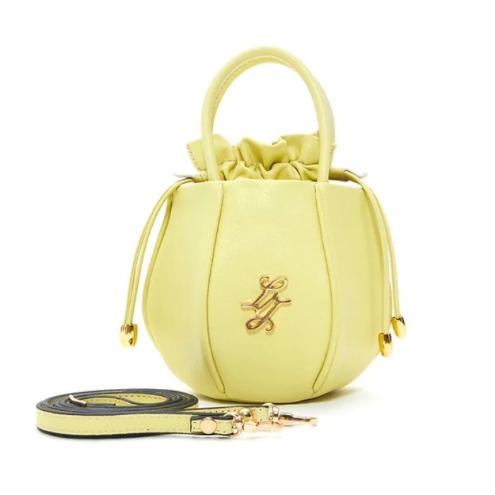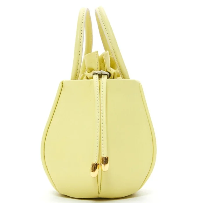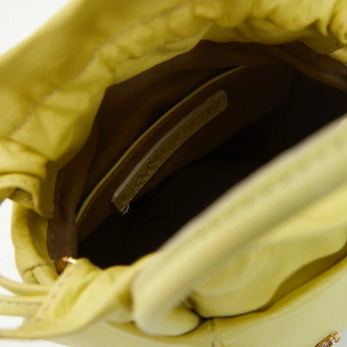 Leather bag with detachable and adjustable shoulder strap and drawstring closure.