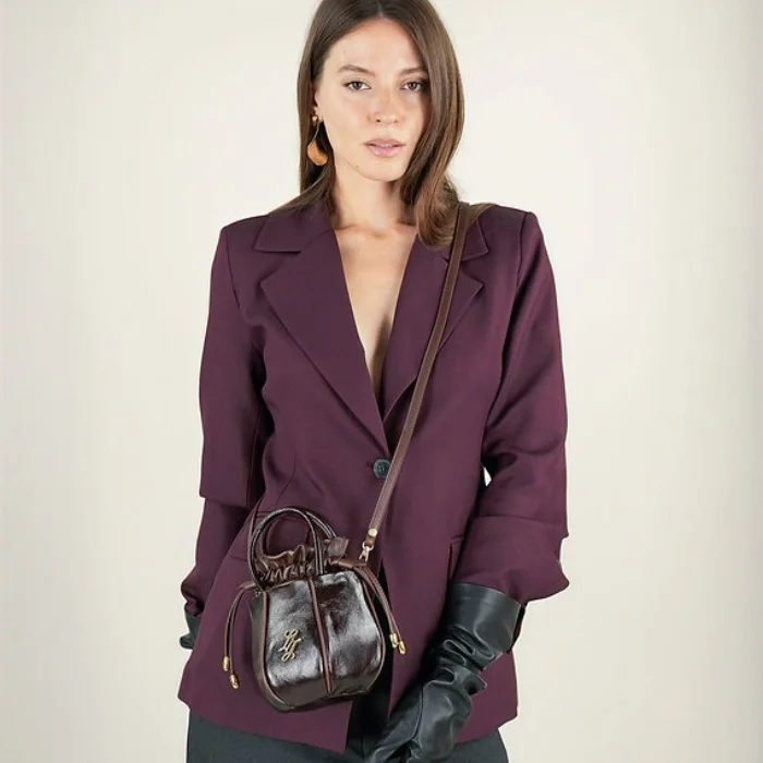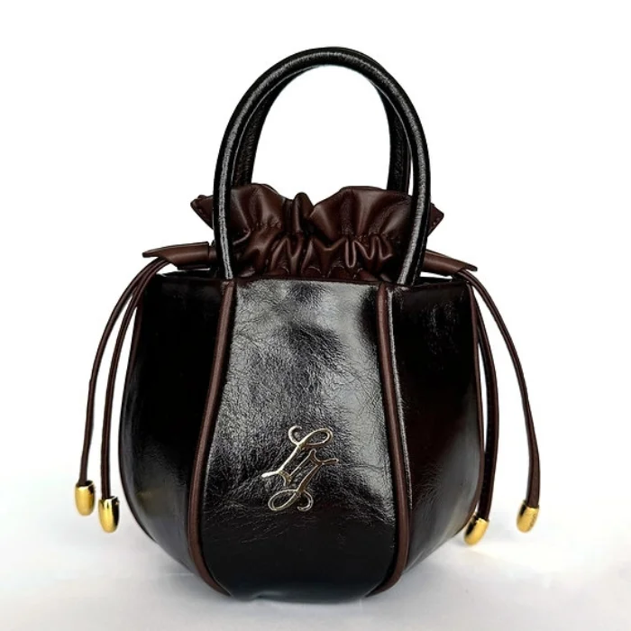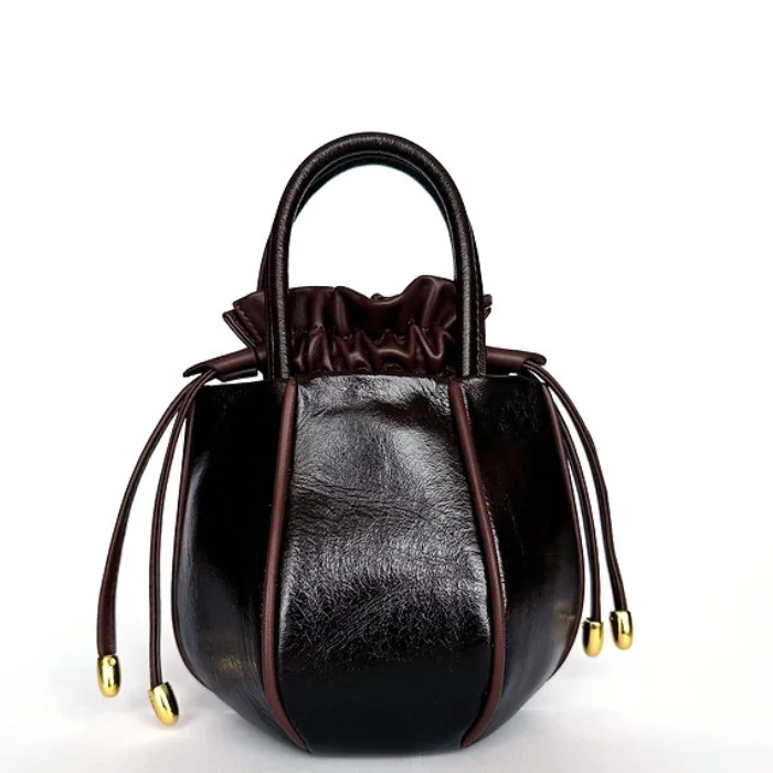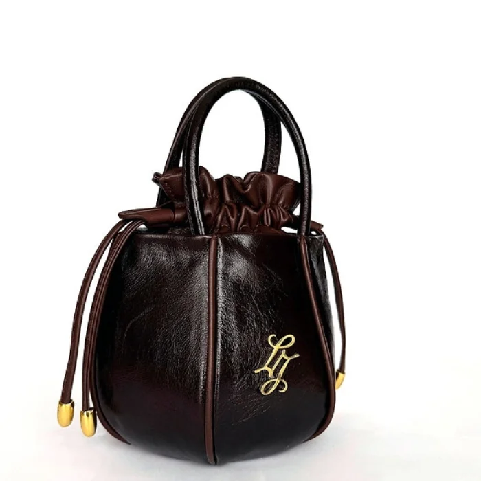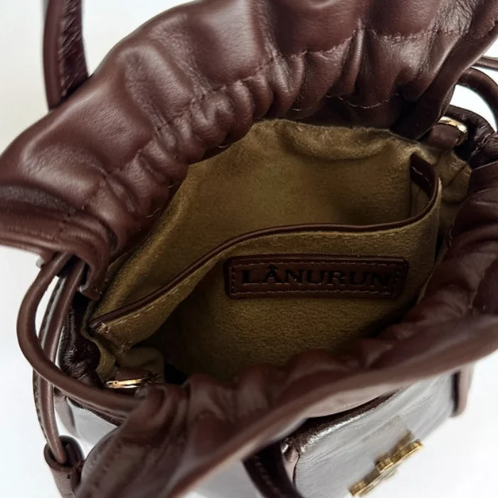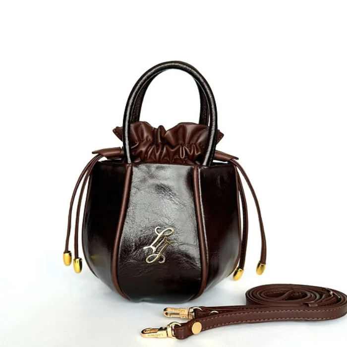 Leather bag with detachable and adjustable shoulder strap and drawstring closure.