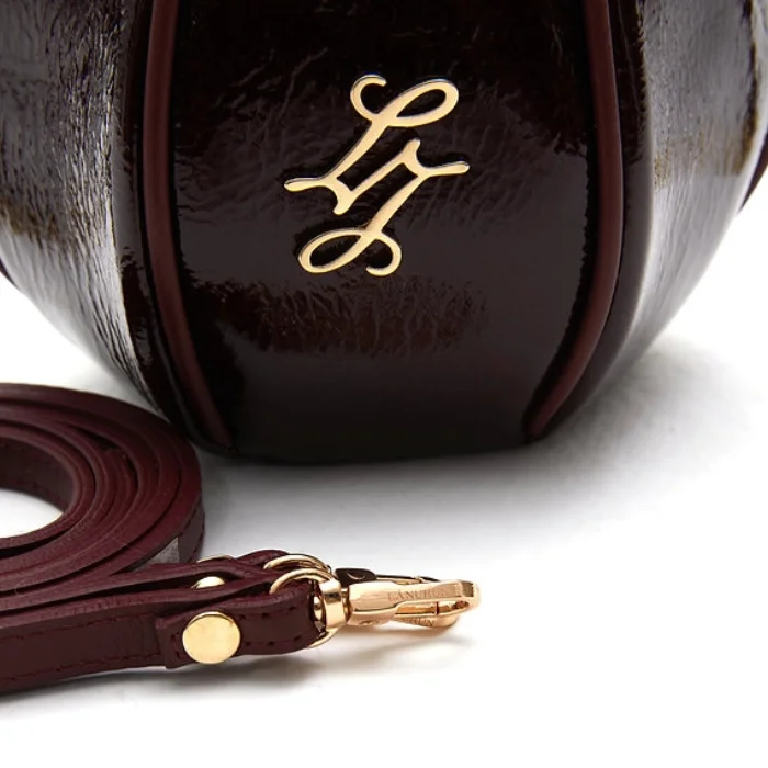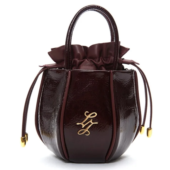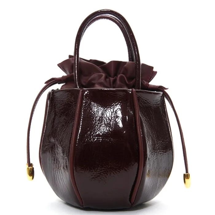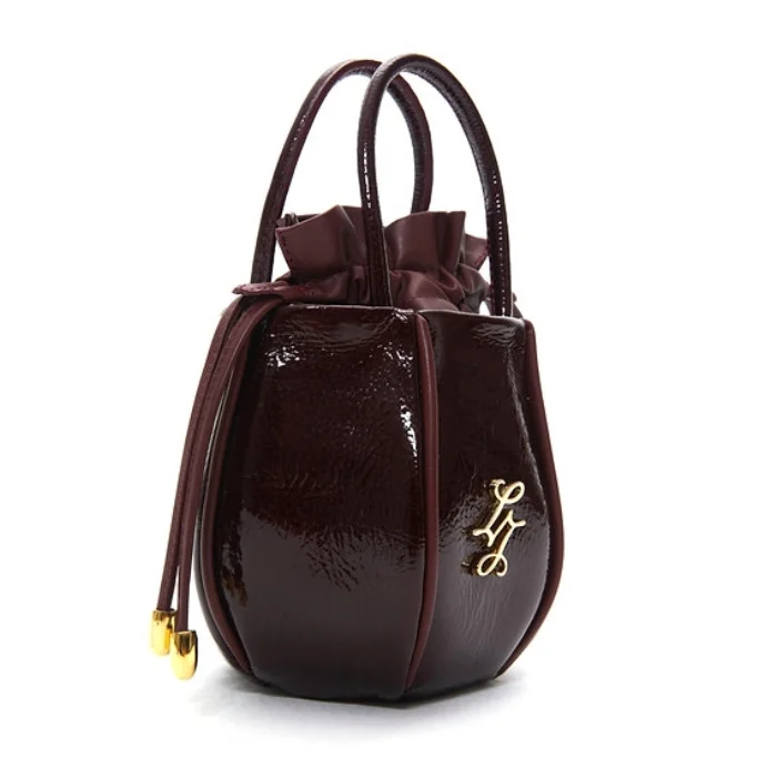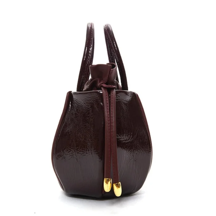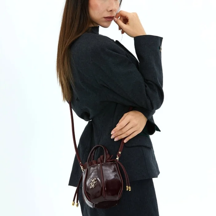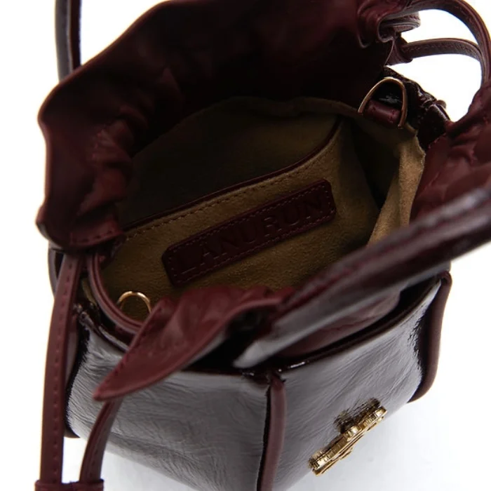 Leather bag with detachable and adjustable shoulder strap and drawstring closure.