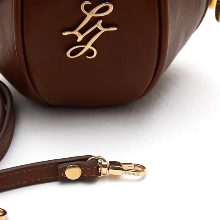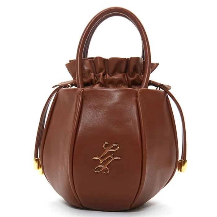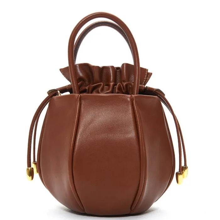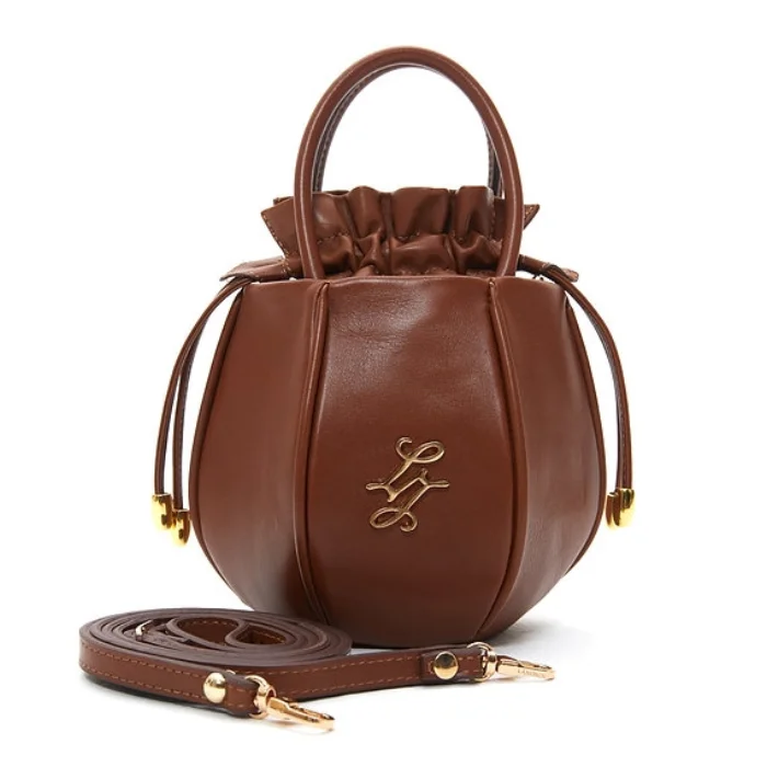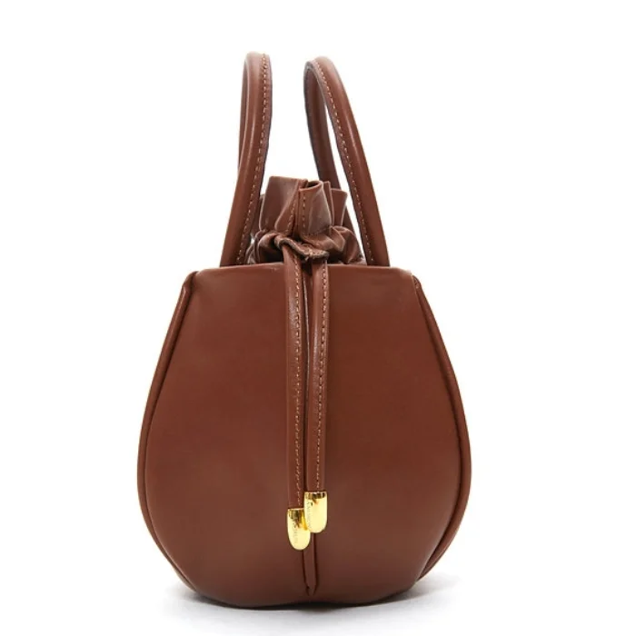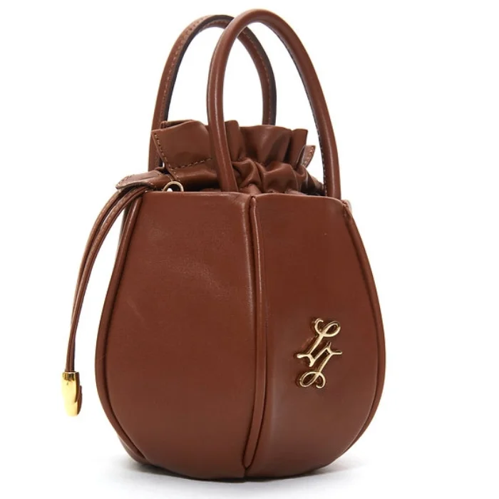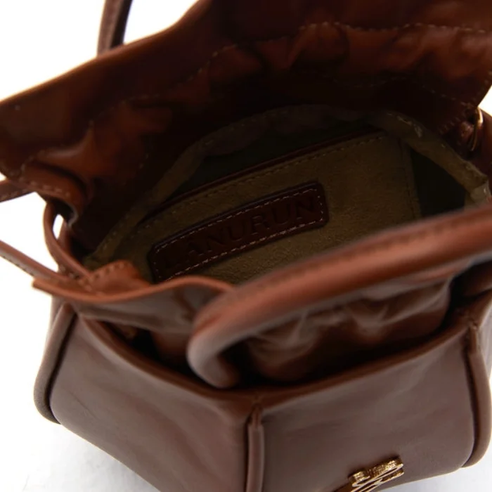 Leather bag with detachable and adjustable shoulder strap and drawstring closure.