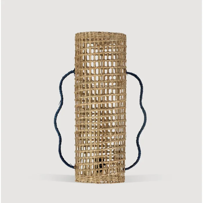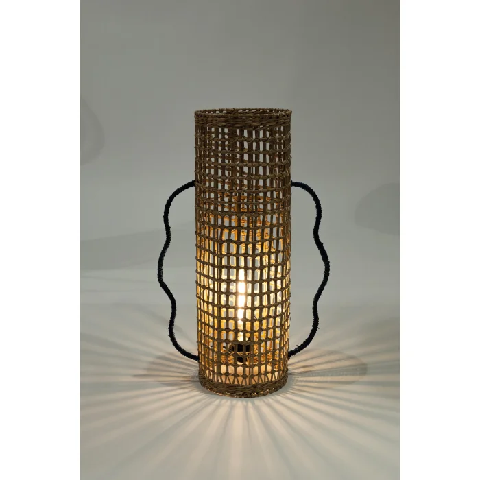A stylish and modern floor lamp is visible. Designed with a cylindrical mesh pattern, the lampshade has a structure that looks like it is made of natural materials. The braided structure of the lampshade allows the light to pass through it, creating a warm and soft illumination in the room. The dark wavy handle details on both sides of the floor lamp add an aesthetic touch to the design and offer a decorative look. This type of floor lamp fits perfectly into interiors decorated in a bohemian or rustic style and creates a natural atmosphere.