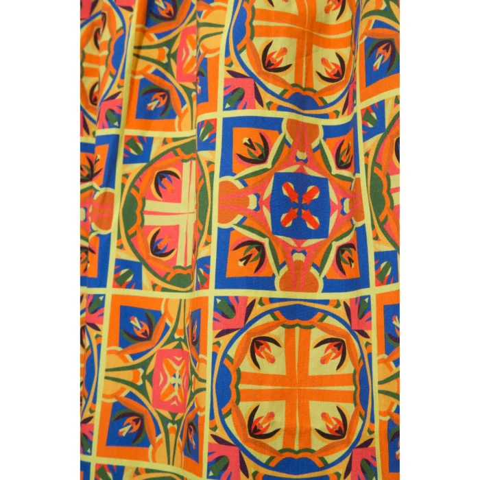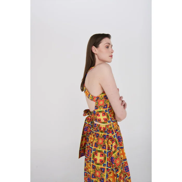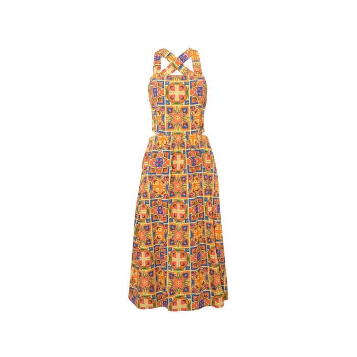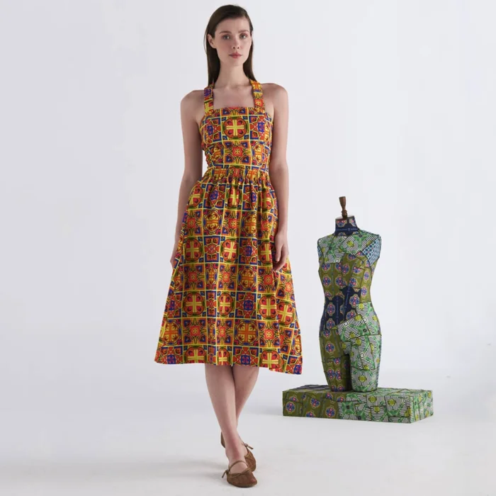 *Patterns are created from the works of Artist Defne Camcıoğlu, *100% Cotton, * The product is carefully designed with fine-textured and tough poplin fabric, considering durability and comfort, * The work, which consists of geometric patterns, is printed on poplin fabric by digital printing method, * The product is sleeveless, with midi length detail, * The product, which has a square neckline, offers a stylish look with its back décolleté. CARE RECOMMENDATIONS: * Washing can be done at 30 degrees, *Bleach cannot be used, *Do not dry in the machine. BODY MEASUREMENTS S: HEIGHT: 101 cm WAIST: 62 cm M: HEIGHT: 103 cm WAIST: 66 cm