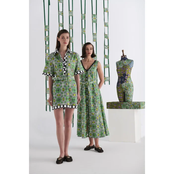 *Patterns are created from the works of Artist Defne Camcıoğlu, *100% Cotton, * The product is carefully designed with fine-textured and tough poplin fabric, considering durability and comfort, * The work, which consists of geometric patterns, is printed on poplin fabric by digital printing method, * The product is sleeveless, long length detailed, * The product, which has a V-neck, offers a stylish look with its water stone and belt detail. CARE RECOMMENDATIONS: * Washing can be done at 30 degrees, *Bleach cannot be used, *Do not dry in the machine. BODY MEASUREMENTS HEIGHT: 127 cm WAIST: 106 cm BUST: 90 cm