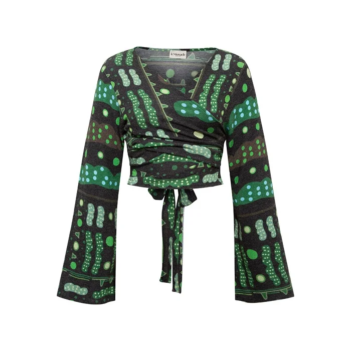 *The drawings consist of paintings by artist Defne Camcıoğlu, *It is a knitted fabric containing 82% Viscose, 13% Acrylic, 5% Elastane, *It has a warm touch with a fabric brush/feather, *Patterns are printed with digital printing method, *The product is determined as one size due to its flexible lycra fabric structure, it adapts to many forms, *The blouse with double-breasted detail offers a stylish look with its back tie feature.