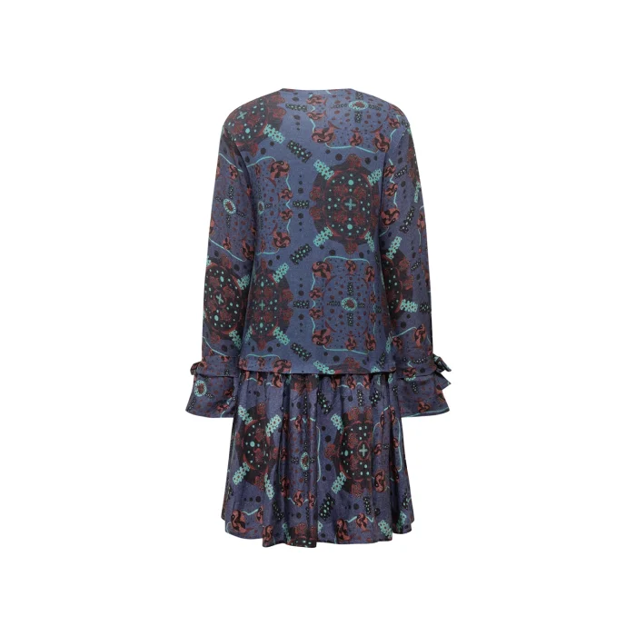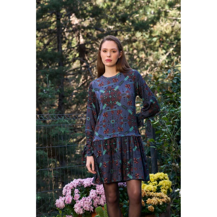 The drawings consist of paintings by artist Defne Camcıoğlu. The product consists of 2 fabric combinations. While the upper part of the product is a knitted product with 82% Viscose, 13% Acrylic, 5% elastane content, the lower part is 100% viscose content and the weaving type is twill. The upper area fabric has a warm touch with brushes/feathers. The patterns are printed with digital printing method. The products are produced in a combined size with a special and detailed measurement study. S/M: 36-38 M/L: 38-40 sizes. The crew neck dress offers a daily stylish look with its ruffle detail at the end.