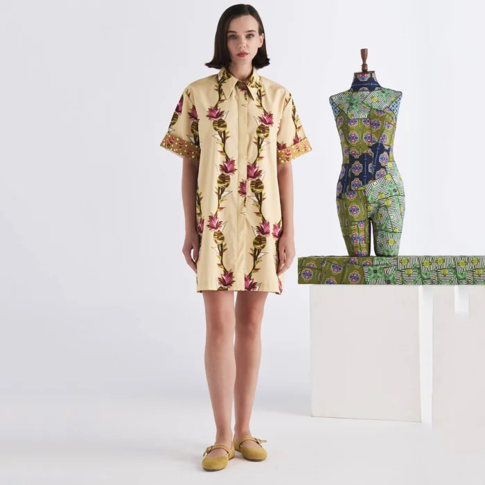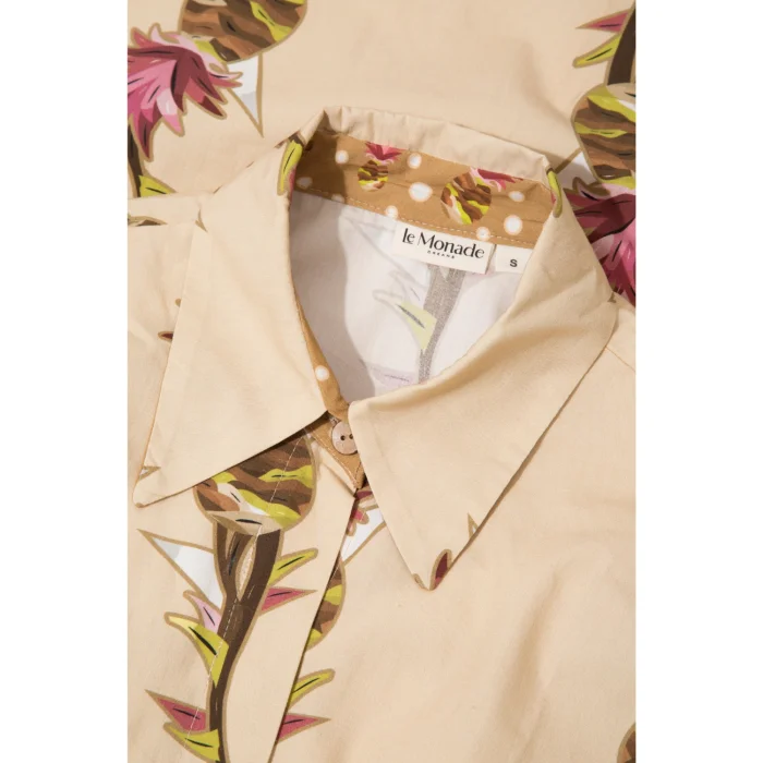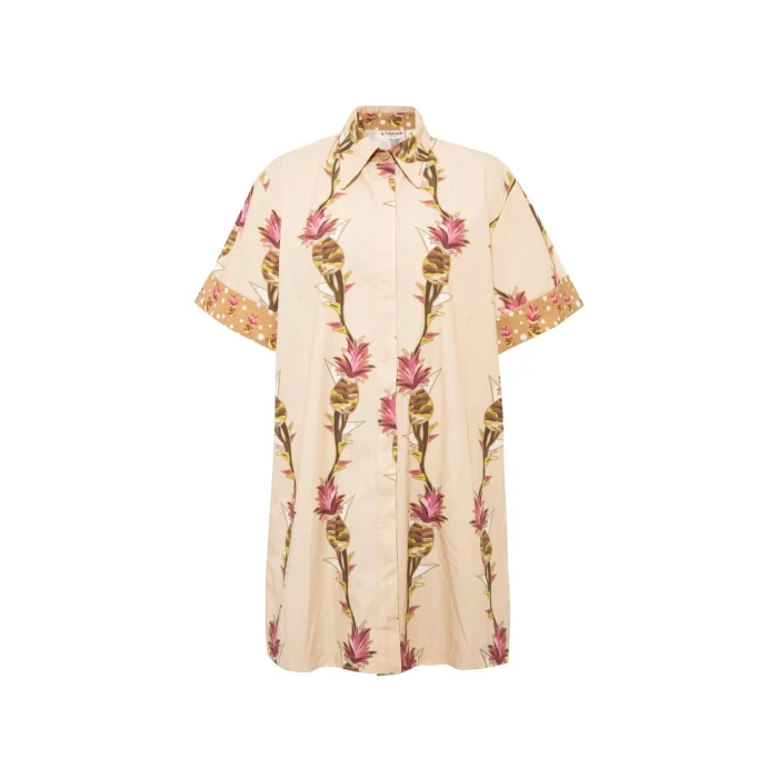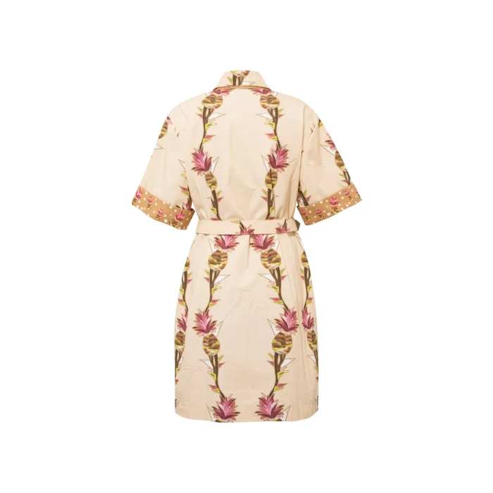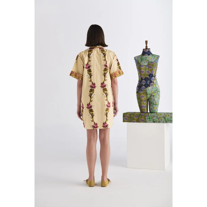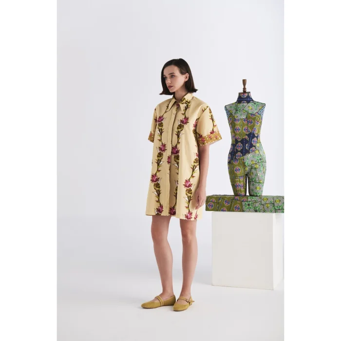 *Patterns are created from the works of Artist Defne Camcıoğlu, *100% Cotton, * The product is carefully designed with fine-textured and tough poplin fabric, considering durability and comfort, * The work, which consists of pineapple patterns, is printed on poplin fabric by digital printing method, * The product consists of a short sleeve, short length detailed shirt dress silhouette, * The product, which has a shirt collar, offers a stylish look with its belt detail. CARE RECOMMENDATIONS: * Washing can be done at 30 degrees, *Bleach cannot be used, *Do not dry in the machine." BODY MEASUREMENTS HEIGHT: 90 cm WAIST: 106 cm