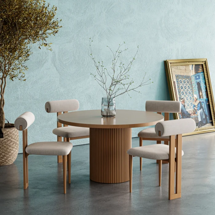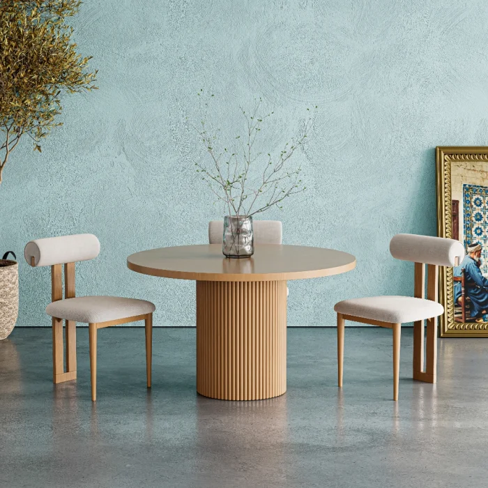 • Beech wood, which is the upper table of the product for 4-6 people, was painted with black lacquer paint by opening the veins with sandblasting technique.