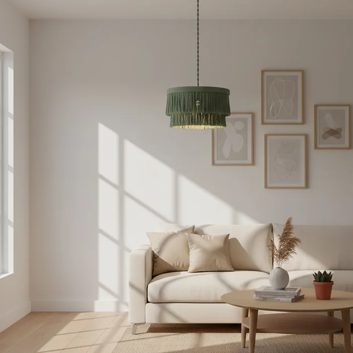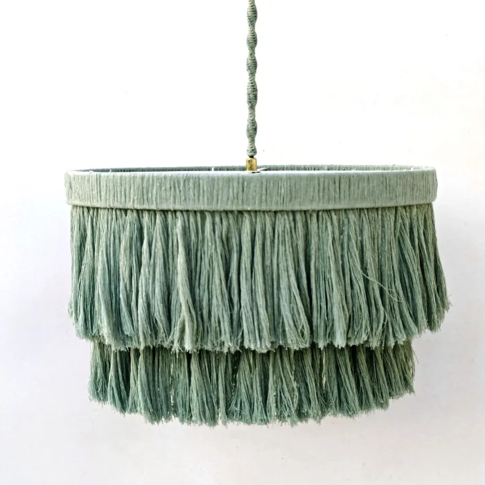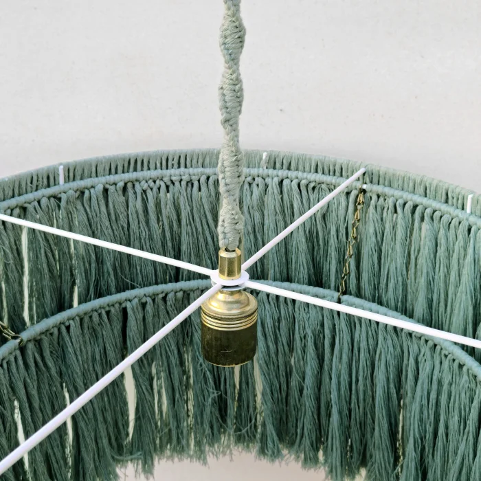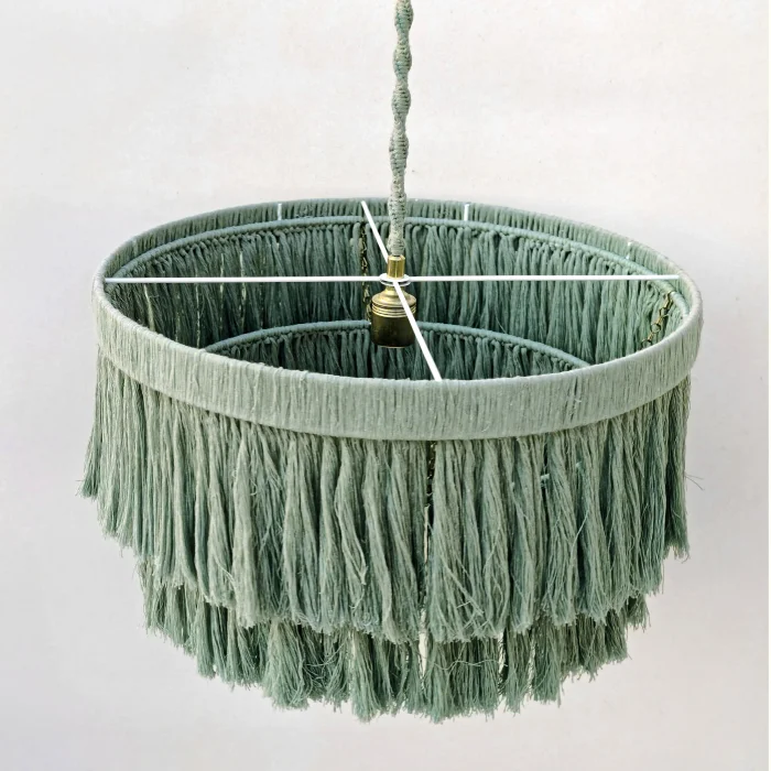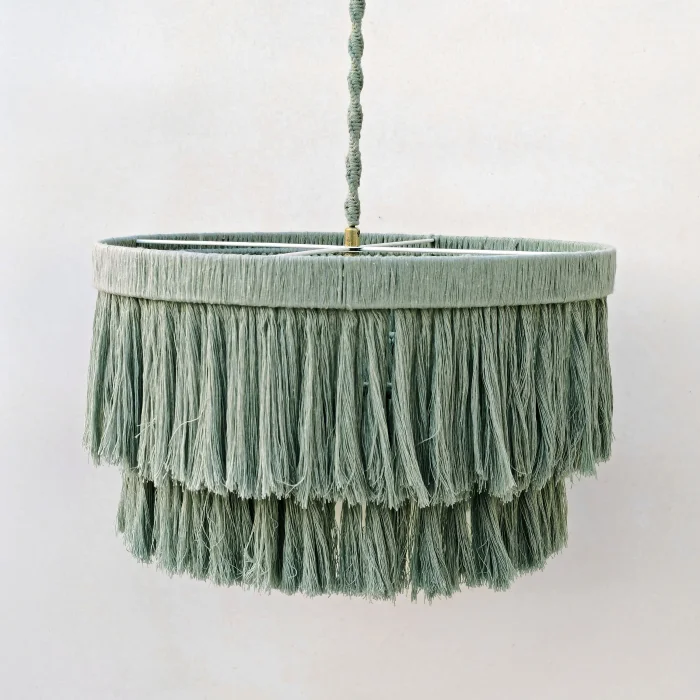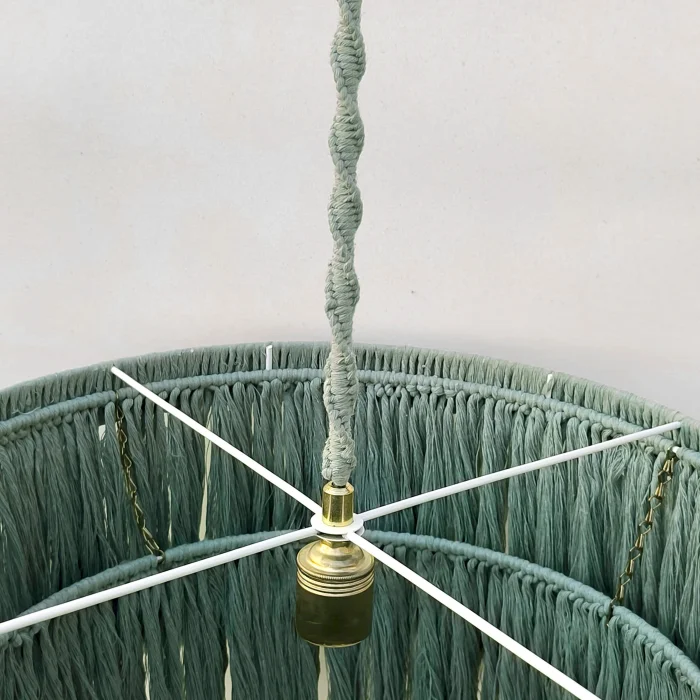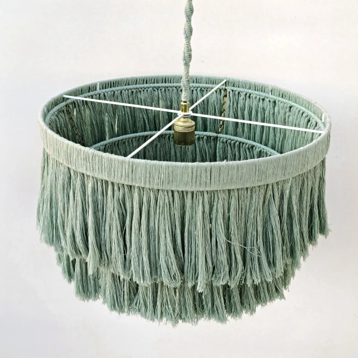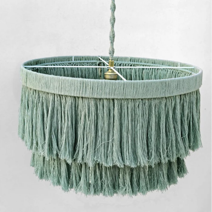 This decorative chandelier, which stands out with its two-storey design with macrame tassels and gold details, brings together the natural texture of handicraft with modern lines, adding a warm and elegant atmosphere to living spaces. Thanks to its balanced form with a diameter of approximately 50 cm, it creates a strong but non-tiring focal point in the space. Handmade macrame threads filter light softly, while metal gold details add a stylish and sophisticated contrast to the design. Compatible with the E27 lamp holder, the chandelier allows the desired light ambiance to be created with different bulb options and is shipped ready to use without the need for installation. It offers an aesthetic lighting solution that complements bohemian, modern, rustic and natural decoration styles in many spaces such as living rooms, dining areas, bedrooms, entrances, cafes, boutiques or hotels.