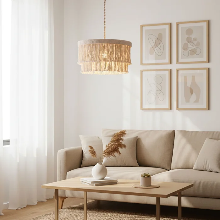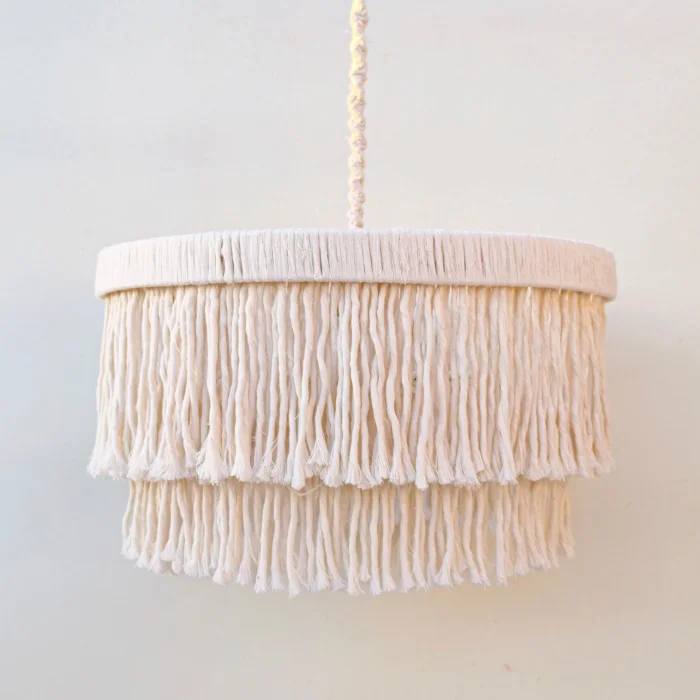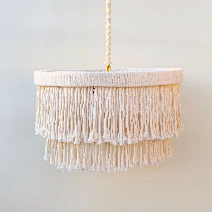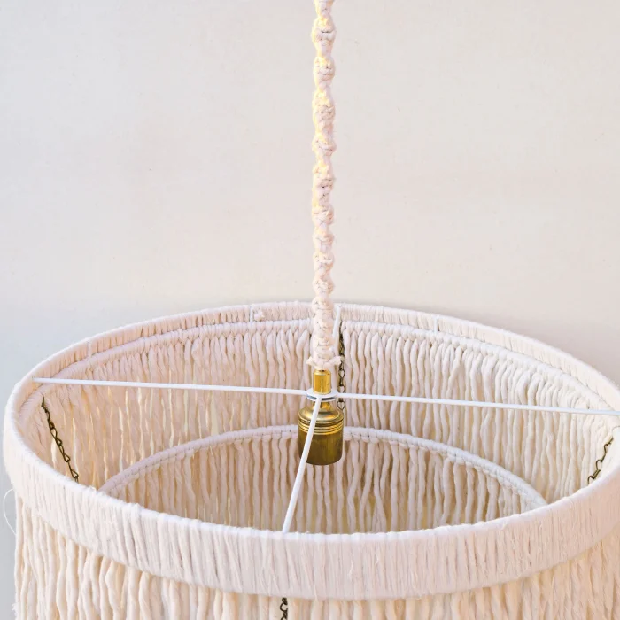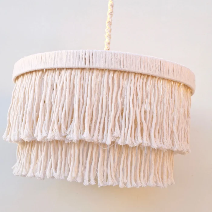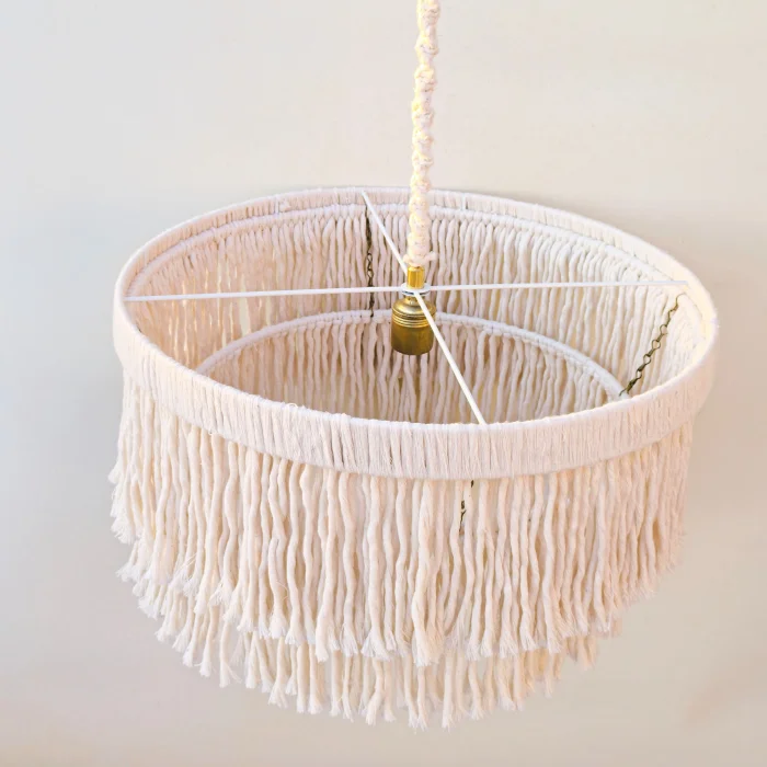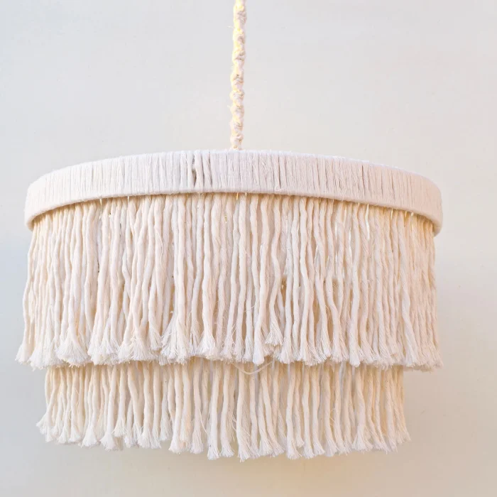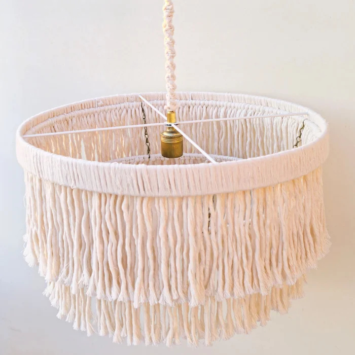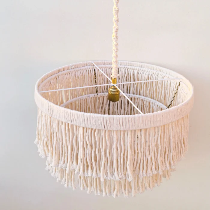 This decorative chandelier, which stands out with its two-storey design with macrame tassels and gold details, brings together the natural texture of handicraft with modern lines, adding a warm and elegant atmosphere to living spaces. Thanks to its balanced form with a diameter of approximately 50 cm, it creates a strong but non-tiring focal point in the space. Handmade macrame threads filter light softly, while metal gold details add a stylish and sophisticated contrast to the design. Compatible with the E27 lamp holder, the chandelier allows the desired light ambiance to be created with different bulb options and is shipped ready to use without the need for installation. It offers an aesthetic lighting solution that complements bohemian, modern, rustic and natural decoration styles in many spaces such as living rooms, dining areas, bedrooms, entrances, cafes, boutiques or hotels.