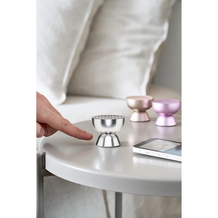– Mini Bluetooth® speaker can pair an infinite number of – Can be paired with TWS – Touch control on the base for volume controls and volume adjustment – Hands-free microphone – Selfie trigger – Suitable for outdoor use (IPX4) – Battery life: up to 3 hours – Charging time: 1 hour – USB-C (cable included) or contactless rechargeable – Power adapter: USB 5V (not included) Aluminum – ABS 5.3 x 4.2 cm 55 g
