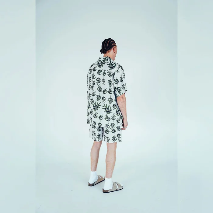 Unisex short-sleeved free neckline, hand-drawn olive branch patterned shirt, classic oversize cut in green CO-ORD.  Main Fabric: 100% COTTON Machine Wash 30 °C Do not dry in a dryer. Wash by turning upside down. Wash with similar colors.