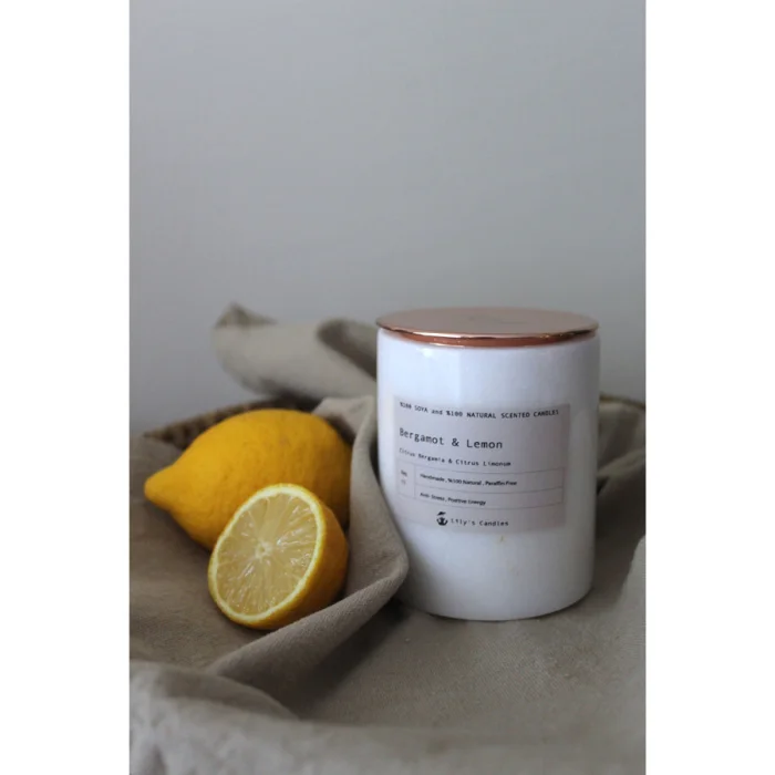 Bergamot & Lemon scented %100 natural soy candle have anti-stress and positive energy aromatheraphy effect.