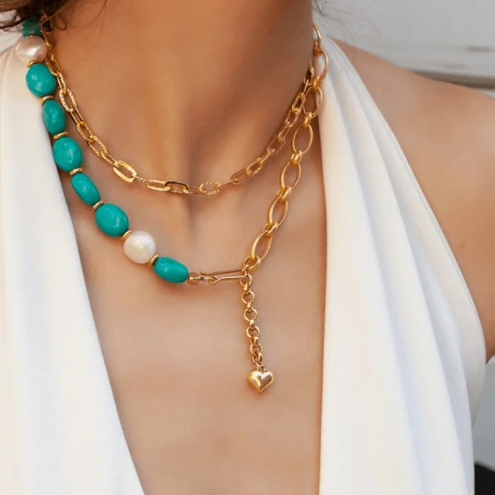 It is a half natural turquoise stone half silver patterned chain. Necklace length is 45 cm.