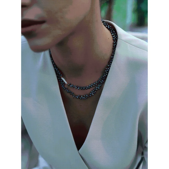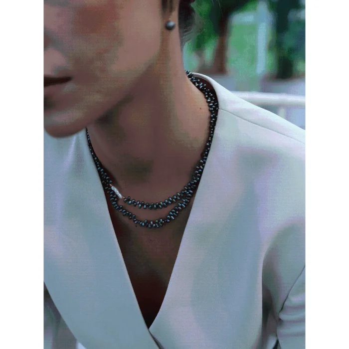 Oden Asymmetrical Black Baroque Pearl Necklace The Asymmetrical Black Baroque Pearl Necklace is a special accessory that draws attention with its modern and stylish design. The asymmetrical placement of Baroque pearls adds a dynamic atmosphere to the necklace, while each pearl offers an authentic aesthetic with its unique form. The deep and sophisticated shades of black baroque pearl pair perfectly with any outfit. This necklace, which you can use both in daily life and in special invitations, complements your style and adds an elegant touch to every moment. The Asymmetrical Black Baroque Pearl Necklace is an ideal choice for those looking for elegance and originality together. This special piece, which you can gift to yourself or your loved ones, will have an indispensable place in your jewelry collection. Necklace Features: 925 Sterling Silver 22K Gold plated Natural Black Pearl and Baroque Pearl are used. Color: Gold Necklace Length: 40cm+5cm extension
