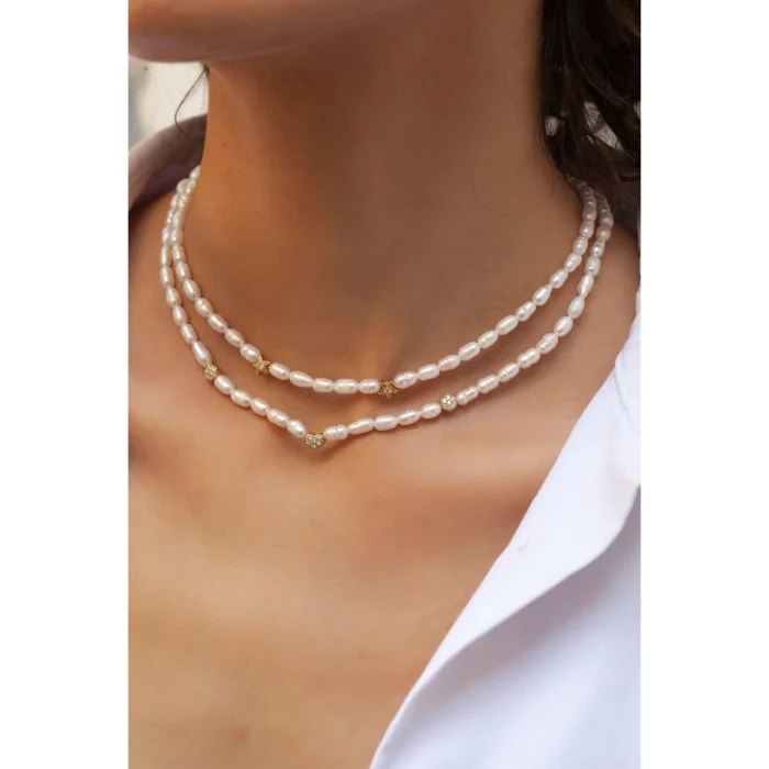 Romes Heart Pearl Necklace Every single detail of the necklace is made by hand and the pearls are selected completely natural. This necklace will be an accessory that you can use every day with its elegance and elegance. The heart design with stones, which is the focal point of the necklace, is one of the most popular trends in today's fashion. At the same time, it will also help you express your connection with your loved ones. Capture extraordinary elegance with our necklaces with heart designs, every detail of which is made by hand, adorned with completely natural pearls and designed with hearts! Romes Heart Pearl Necklace Features: 925 Sterling silver; 22K Gold plated; Necklace Color: Gold; Approximate Silver Weight: 13.23 grams. ; Natural barley pearl is used. On the spacers, the minimal heart symbol and the dair symbol are stone-set. ; It is 40 cm long, has an extension of 2 cm, is adjustable. ;