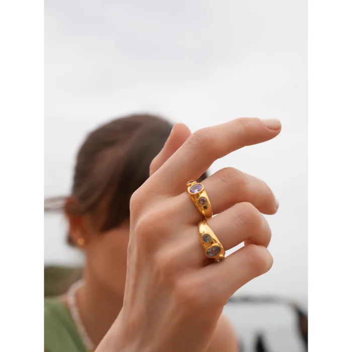 Rosie Colored Stone Ring Features: 925 Sterling Silver 22K Gold Plated Stone Colors: Blue, White, Pink, Yellow Orange, Yellow Green, Lilac Pink The ring size is adjustable. Ring Gram: 3,80gr