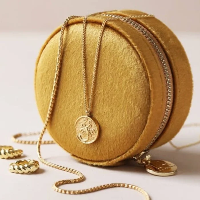 Product: Lisa Angel - Mustard Round Velvet Jewellery Case With Floral Lining