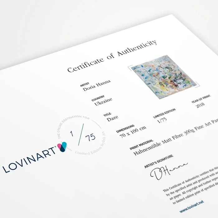 LIMITED EDITION ART PRINTS An edition is defined as a copy or replica of a work of art made from a master. When making production in limited editions, the number of editions to be produced is determined in advance under the supervision of the painter, and the work is not produced more than this number. CERTIFICATE of AUTHENTICITY The limited edition artwork is sent to the art buyer together with the signature of the artist on the 'Certificate of Authenticity' indicating which copy of the total editions. In addition, all the printing details, including the printing technique, quality and the fine art paper used, are listed on the certificate. MUSEUM-QUALITY PRINTING & MODERN FRAMING OPTIONS Museum-quality archival pigment prints that we produce using Giclée (Spraying) technique on Hahnemühle fine art paper with world class printing machines are fine art prints with a life span of more than 100 years under normal room conditions. Acid-free and 100% cotton-based Hahnemühle fine art papers are excellent in terms of proximity to the original work in details and colors, and are guaranteed against fading. DIASEC works are printed on metallic photo paper with C-Print technic. You can either order only fine art prints in rolls or choose from our modern framing alternatives according to your taste and receive them ready to be hung. We do the completely hand-crafted and meticulous framing process with long-lasting, quality materials.
