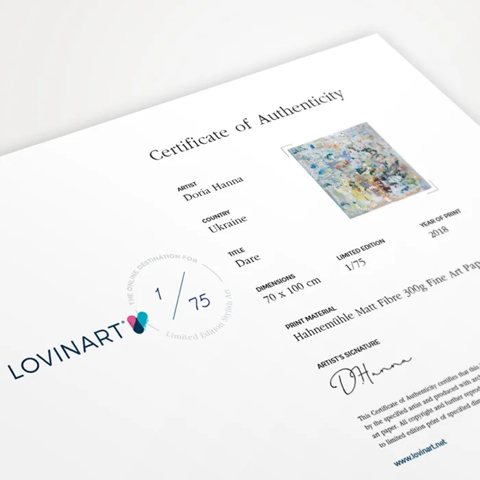 LIMITED EDITION ART PRINTS An edition is defined as a copy or replica of a work of art made from a master. When making production in limited editions, the number of editions to be produced is determined in advance under the supervision of the painter, and the work is not produced more than this number. CERTIFICATE of AUTHENTICITY The limited edition artwork is sent to the art buyer together with the signature of the artist on the 'Certificate of Authenticity' indicating which copy of the total editions. In addition, all the printing details, including the printing technique, quality and the fine art paper used, are listed on the certificate. MUSEUM-QUALITY PRINTING & MODERN FRAMING OPTIONS Museum-quality archival pigment prints that we produce using Giclée (Spraying) technique on Hahnemühle fine art paper with world class printing machines are fine art prints with a life span of more than 100 years under normal room conditions. Acid-free and 100% cotton-based Hahnemühle fine art papers are excellent in terms of proximity to the original work in details and colors, and are guaranteed against fading. DIASEC works are printed on metallic photo paper with C-Print technic. You can either order only fine art prints in rolls or choose from our modern framing alternatives according to your taste and receive them ready to be hung. We do the completely hand-crafted and meticulous framing process with long-lasting, quality materials.