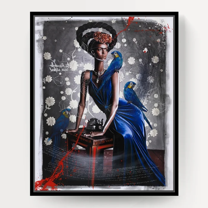 Product: Black Frida Seated With Blue Macaws By Efren Isaza Print