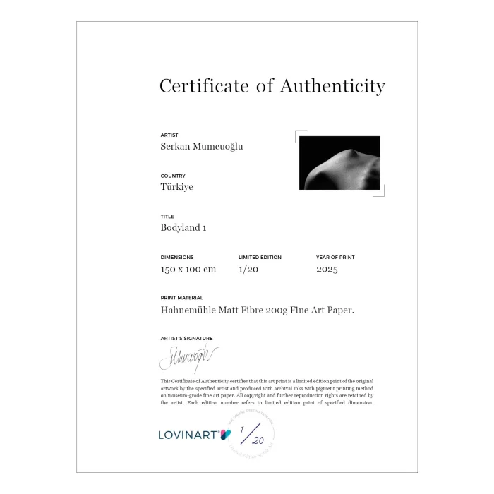 LIMITED EDITION ART PRINTS An edition artwork is defined as a copied or verbatim reproduction of an original work. While producing in limited editions, the number of editions of the work to be produced is determined in advance under the supervision of the artist who owns the work, and the work is not produced more than this number. CERTIFICATE OF AUTHENTICITY A limited edition artwork is sent to the art buyer with the artist's signature and the 'Certificate of Authenticity' indicated on which copy of which edition it is. In addition, all printing features, including the technique and quality with which it is produced, and the fine art paper used, are included on the certificate. MUSEUM-QUALITY PRINTS AND MODERN FRAMING OPTIONS Museum-quality archival pigment prints that we produce using Giclée (spraying) technique on only 200 grams of Hahnemühle fine art paper with world-class printing machines; They are fine art prints that have a lifespan of more than 100 years under normal room conditions. Acid-free and 100% cotton-based, Hahnemühle fine art papers, which give excellent results in terms of closeness to the original work in details and colors, are also guaranteed against fading. You can only order fine art prints of your works in rolls, and you can even choose the one that suits your taste from our modern frame alternatives and receive them ready to be hung. We make the framing process, which we carry out completely handcrafted and meticulously, with long-lasting, quality materials.