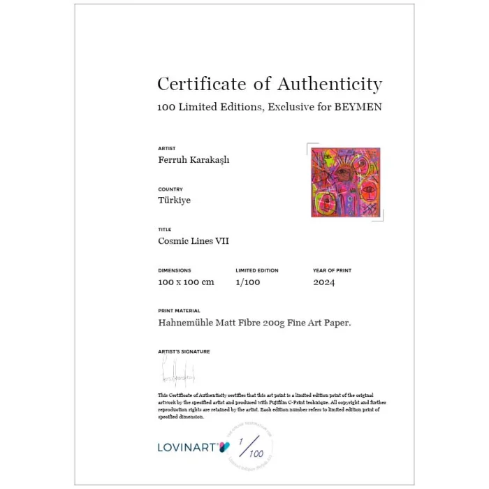 Lımıted Edıtıon Art Prınts An Edition Artwork İs Defined As A Copied Or Verbatim Reproduction Of An Original Work. While Producing İn Limited Editions, The Number Of Editions Of The Work To Be Produced İs Determined İn Advance Under The Supervision Of The Artist Who Owns The Work, And The Work İs Not Produced More Than This Number. Certıfıcate Of Authentıcıty A Limited Edition Artwork İs Sent To The Art Buyer With The Artist'S Signature And The 'Certificate Of Authenticity' İndicated On Which Copy Of Which Edition İt İs. In Addition, All Printing Features, İncluding The Technique And Quality With Which İt İs Produced, And The Fine Art Paper Used, Are İncluded On The Certificate. Museum-Qualıty Prınts And Modern Framıng Optıons Museum-Quality Archival Pigment Prints That We Produce Using Giclée (Spraying) Technique On Only 200 Grams Of Hahnemühle Fine Art Paper With World-Class Printing Machines; They Are Fine Art Prints That Have A Lifespan Of More Than 100 Years Under Normal Room Conditions. Acid-Free And 100% Cotton-Based, Hahnemühle Fine Art Papers, Which Give Excellent Results İn Terms Of Closeness To The Original Work İn Details And Colors, Are Also Guaranteed Against Fading. You Can Only Order Fine Art Prints Of Your Works İn Rolls, And You Can Even Choose The One That Suits Your Taste From Our Modern Frame Alternatives And Receive Them Ready To Be Hung. We Make The Framing Process, Which We Carry Out Completely Handcrafted And Meticulously, With Long-Lasting, Quality Materials.