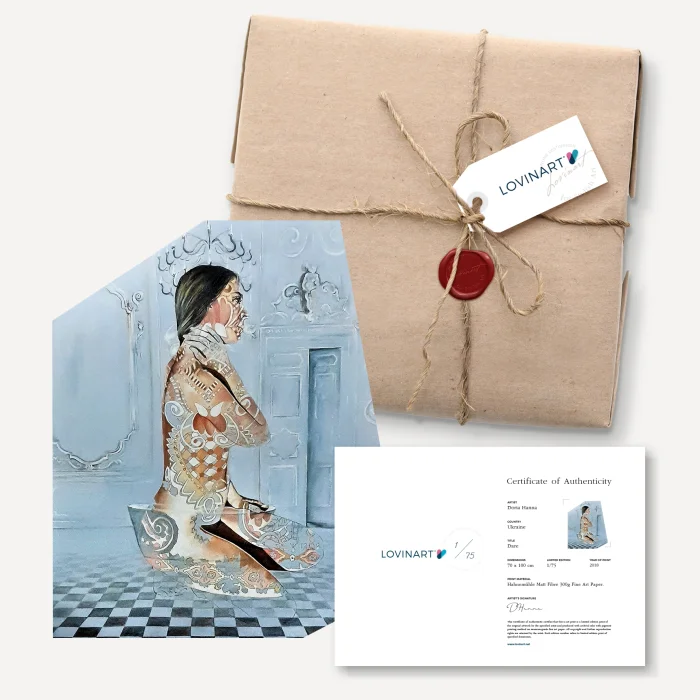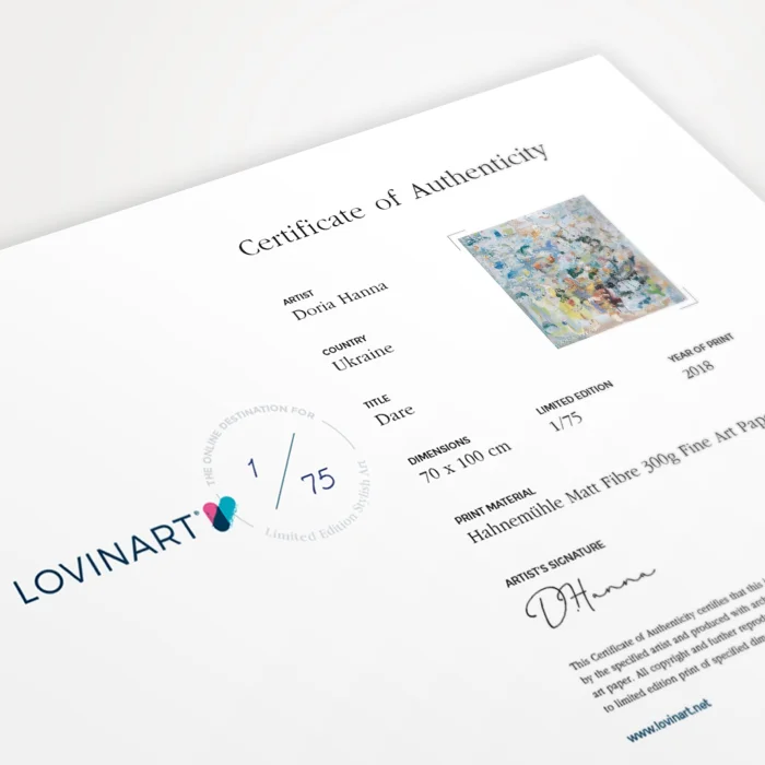 LIMITED EDITION ART EDITIONS An edition artwork is defined as a copied or verbatim reproduced version of a original work. When producing in limited editions, the number of editions of the work is determined in advance under the supervision of the artist who owns the work and the work is not produced more than this number. AUTHENTICITY CERTIFICATE A limited edition artwork is sent to the art buyer with the artist's signature and the 'Certificate of Authenticity' indicated on which copy of the edition it is. In addition, all printing features, including the technique and quality of production and the fine art paper used, are included on the certificate. MUSEUM-QUALITY PRINTS AND MODERN FRAMING OPTIONS Museum-quality archival pigment prints using the Giclée (spraying) technique on only 200 grams of Hahnemühle fine art paper with world-class printing machines; They are fine art prints that have a life span of more than 100 years under normal room conditions. Hahnemühle fine art papers, acid-free and 100% cotton-based, which are excellent in terms of proximity to the original work in terms of details and colors, are also guaranteed against fading. DIASEC products are printed on Metallic Photo Paper with C-Print technique. You can only order fine art prints of your works in rolls, and even choose from our modern frame alternatives to suit your taste and receive them ready to be hung. We carry out the framing process, which we carry out completely by hand and meticulously, with long-lasting, quality materials.