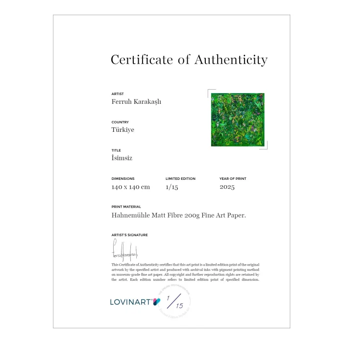 LIMITED EDITION ART PRINTS An edition artwork is defined as a copied or exact reproduced version of an original work. When producing in limited editions, the number of editions of the work is determined in advance under the supervision of the artist who owns the work, and the work is not produced more than this number. CERTIFICATE OF AUTHENTICITY A limited edition work of art is sent to the art buyer with the artist's signature and the 'Certificate of Authenticity' stating the number of copies of the edition. In addition, all printing features, including the technique and quality with which it is produced and the fine art paper used, are included on the certificate. MUSEUM-QUALITY PRINTS AND MODERN FRAMING OPTIONS Museum-quality archival pigment prints that we produce using the Giclée (spraying) technique on only 200 grams of Hahnemühle fine art paper with world-class printing machines; They are fine art prints that have a life of more than 100 years under normal room conditions. Acid-free and 100% cotton-based, Hahnemühle fine art papers, which give excellent results in terms of closeness to the original work in terms of details and colors, are also guaranteed against fading. You can order only fine art prints of your works in rolls, and you can even choose the one that suits your taste from our modern frame alternatives and receive it ready to be hung. We do the framing process, which we carry out completely by hand and meticulously, with long-lasting, quality materials.