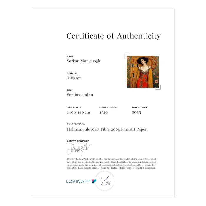 LIMITED EDITION ART PRINTS An edition artwork is defined as a copied or verbatim reproduction of an original work. While producing in limited editions, the number of editions of the work to be produced is determined in advance under the supervision of the artist who owns the work, and the work is not produced more than this number. CERTIFICATE OF AUTHENTICITY A limited edition artwork is sent to the art buyer with the artist's signature and the 'Certificate of Authenticity' indicated on which copy of which edition it is. In addition, all printing features, including the technique and quality with which it is produced, and the fine art paper used, are included on the certificate. MUSEUM-QUALITY PRINTS AND MODERN FRAMING OPTIONS Museum-quality archival pigment prints that we produce using Giclée (spraying) technique on only 200 grams of Hahnemühle fine art paper with world-class printing machines; They are fine art prints that have a lifespan of more than 100 years under normal room conditions. Acid-free and 100% cotton-based, Hahnemühle fine art papers, which give excellent results in terms of closeness to the original work in details and colors, are also guaranteed against fading. You can only order fine art prints of your works in rolls, and you can even choose the one that suits your taste from our modern frame alternatives and receive them ready to be hung. We make the framing process, which we carry out completely handcrafted and meticulously, with long-lasting, quality materials.