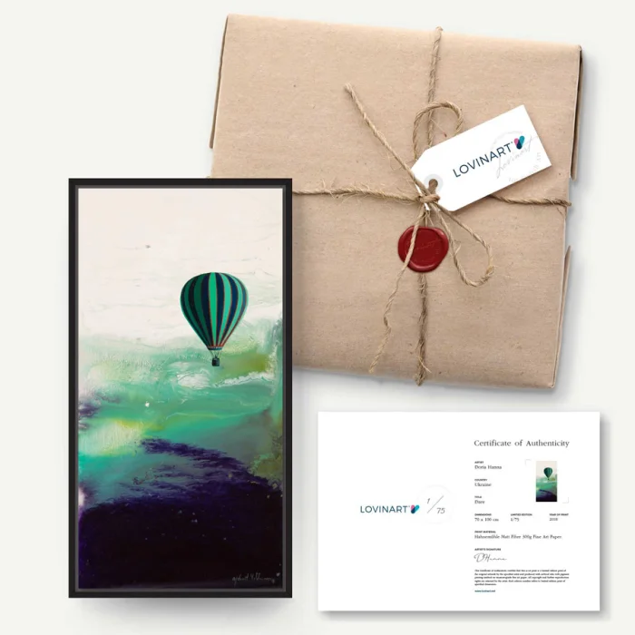 The limited edition artwork is sent to the art buyer together with the signature of the artist on the 'Certificate of Authenticity' indicating which copy of the total editions. In addition, all the printing details, including the printing technique, quality and the fine art paper used, are listed on the certificate.