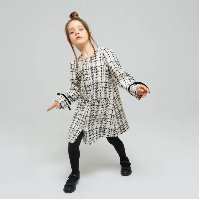 Our dress is made of 100% cotton. It has buttons on the front and velvet stripes on the sleeves.