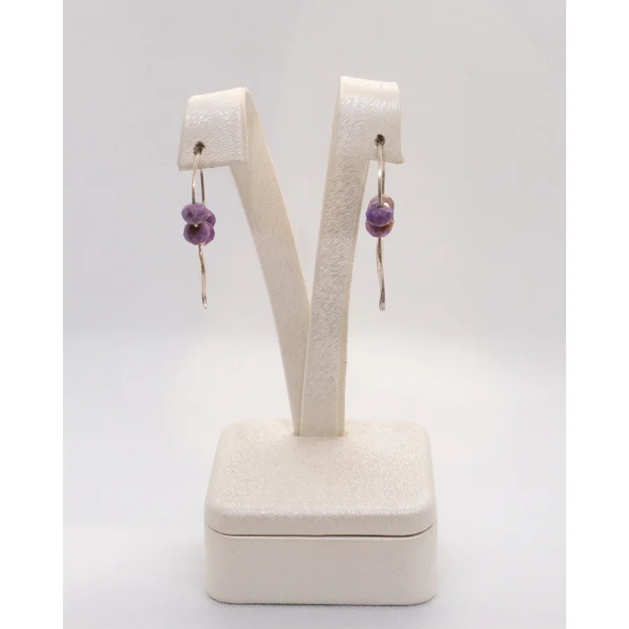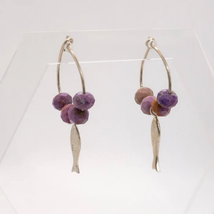 Product: Asymmetrical Earrings With Fish Detail & Natural Lepidolite Stone