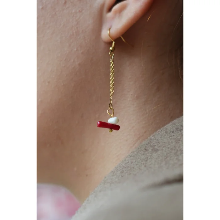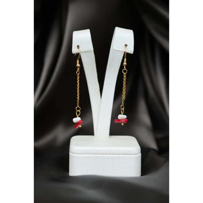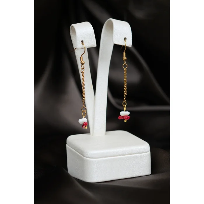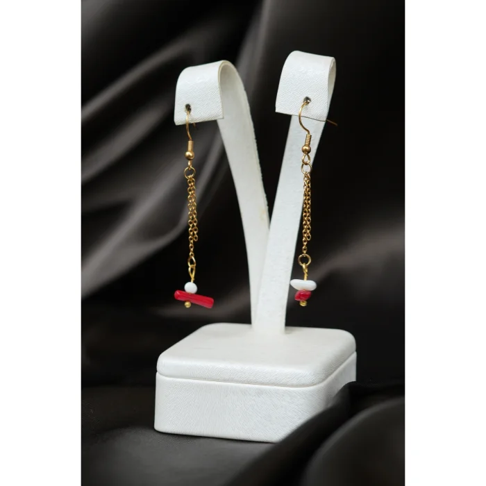 These stylish dangling steel earrings are designed with an elegant combination of white and red coral stones. White coral offers a pure and subtle appearance, while red coral adds vitality and energy. The stainless steel material provides a durable and long-lasting structure. These earrings, which can be used comfortably thanks to their lightweight structure, will complement all kinds of styles with their modern design. It is a perfect accessory that emphasizes your elegance both in daily use and at special events.