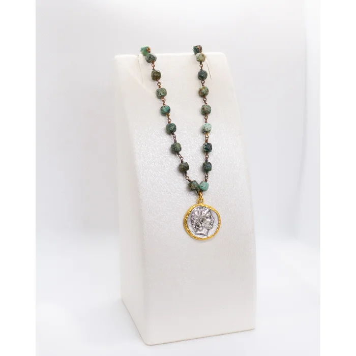 - Decorated with ancient Greek coin details, this necklace, which combines historical touches with modern jewelry, is an unforgettable style statement; - Thanks to the use of top quality serpentine stone, it offers both elegance and durability together; ideal for long-term use.; - With its silver-plated and gold-plated details, it blends in with any outfit, making an elegant addition to your personal style.; - With its unisex design, it appeals to the taste of both women and men; by everyone It can be easily preferred.; - This necklace, which makes you feel quality with its 925 sterling silver material, will accompany you in your precious moments; - Thanks to the use of natural stones, it gives a unique and authentic look and at the same time supports a sustainable fashion sense.; - Designed for the adult age group; It has a wide demographic that appeals to users of all ages.