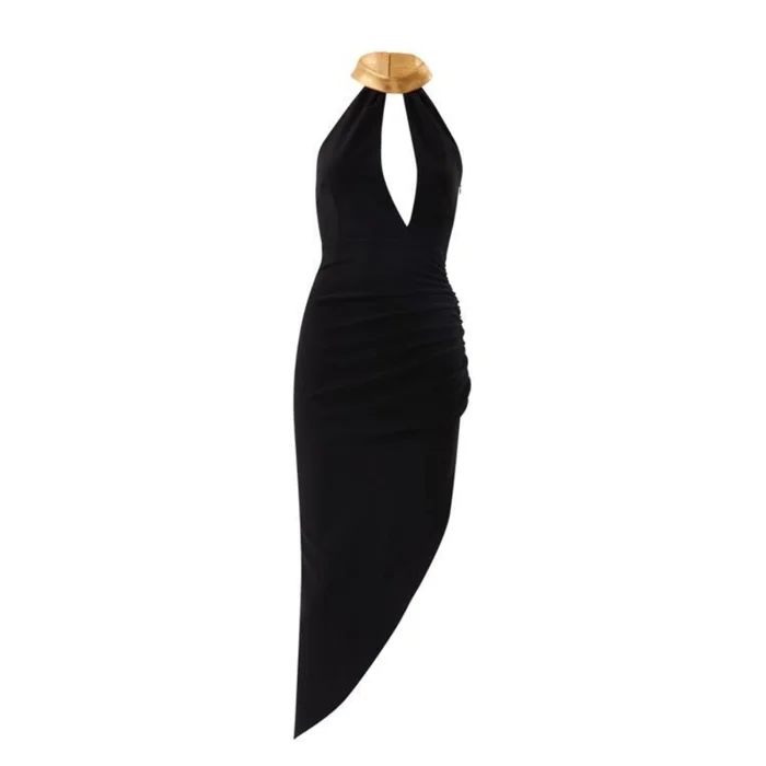 A touch of black asymmetrical goddess with gold details around the neck. The model in the image wears a size 36* Model Size Information Bust: 86-90cm Waist: 63-67cm Hips: 93-97cm