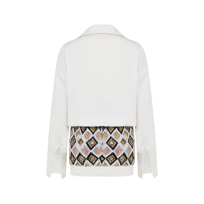 Mini white short dress with mosaic ethnic pattern sequins with mosaic pattern bralette.